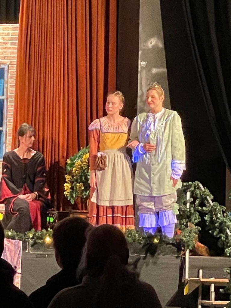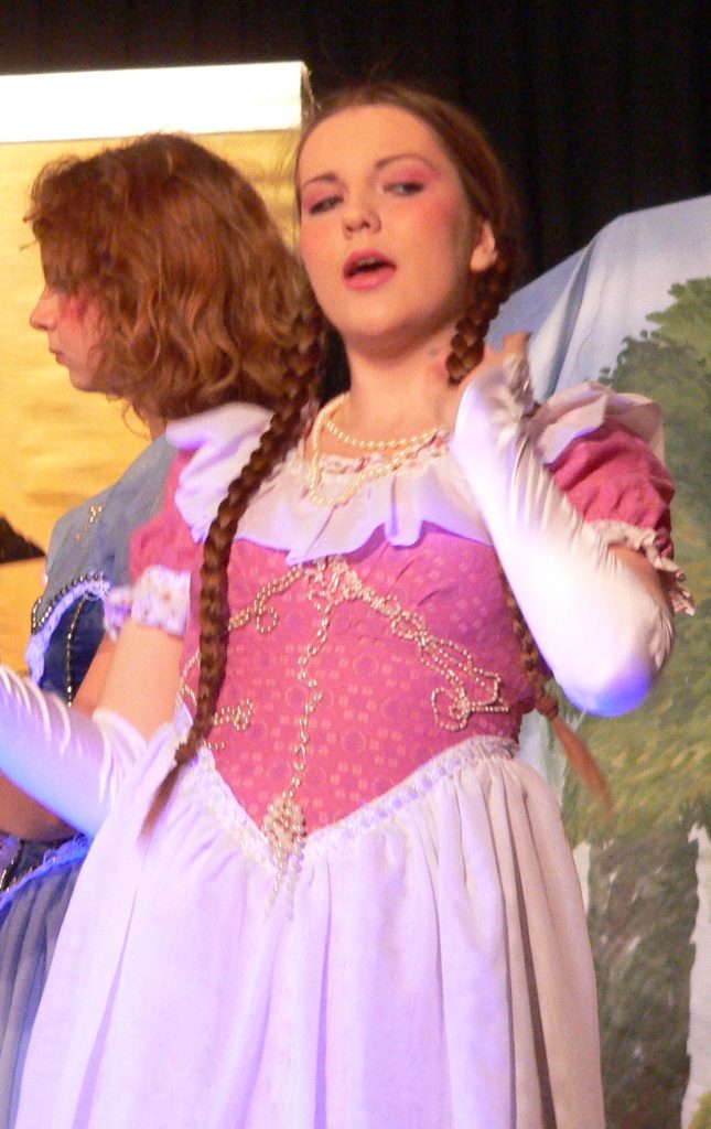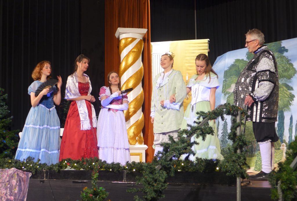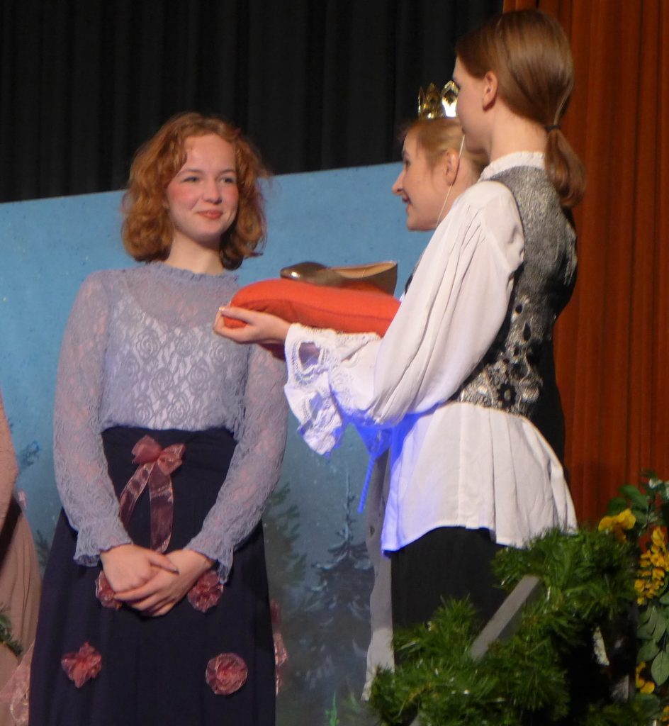 Aschenputtel hat ein schönes Kleid bekommen und trägt goldene Schuhe. Mit einer Kutsche fährt sie nun doch zum Ball und der Prinz tanzt nur mit ihr. Keiner erkennt sie, nicht mal der Stalljunge. Alle „Damen“ sind neidisch. Als sie um Mitternacht davon läuft, verliert sie einen goldenen Schuh.